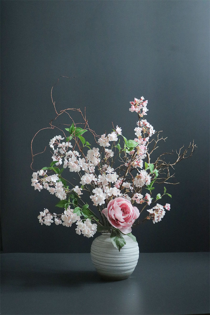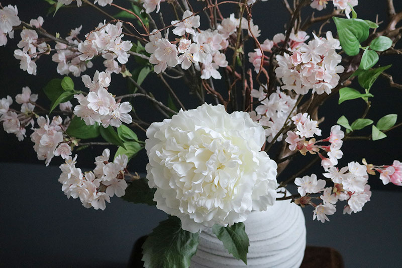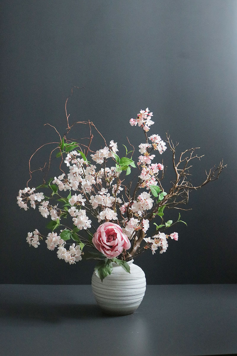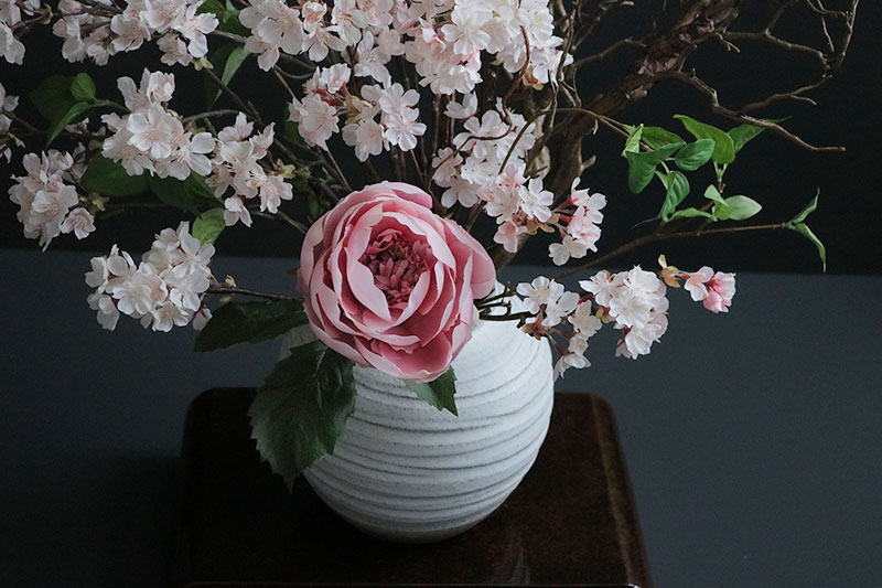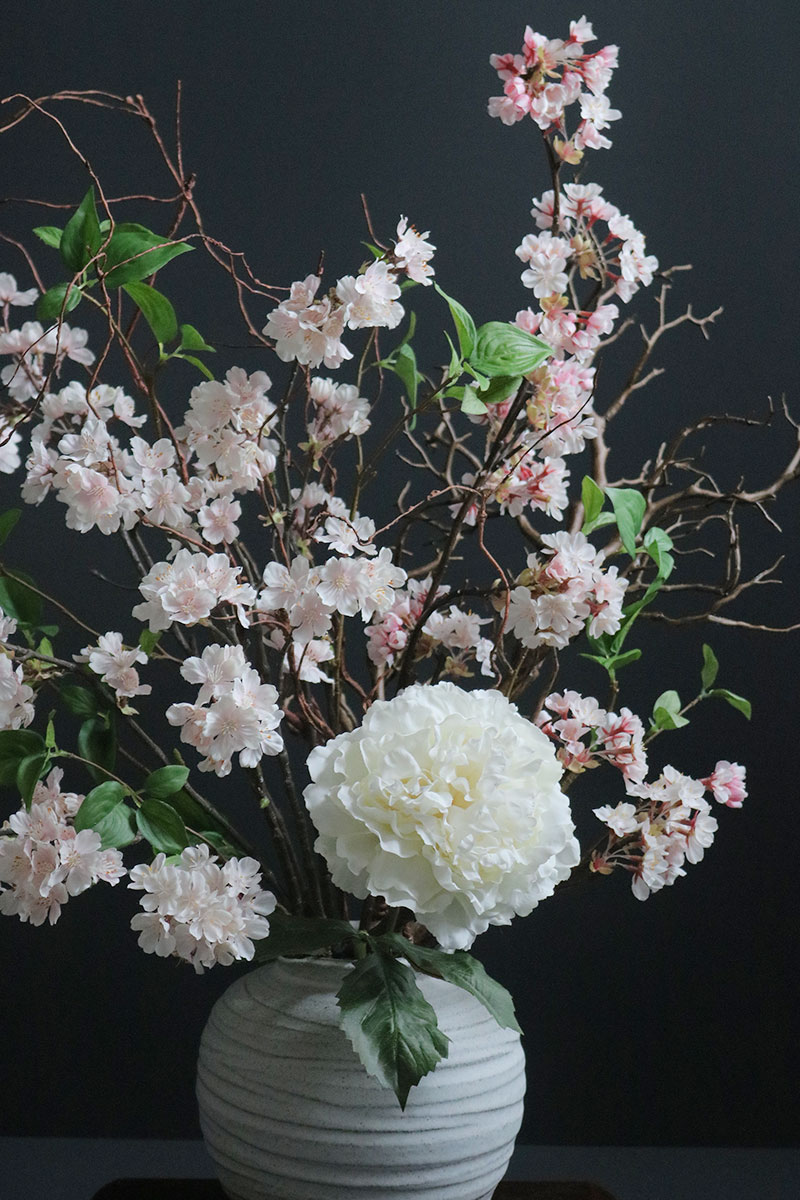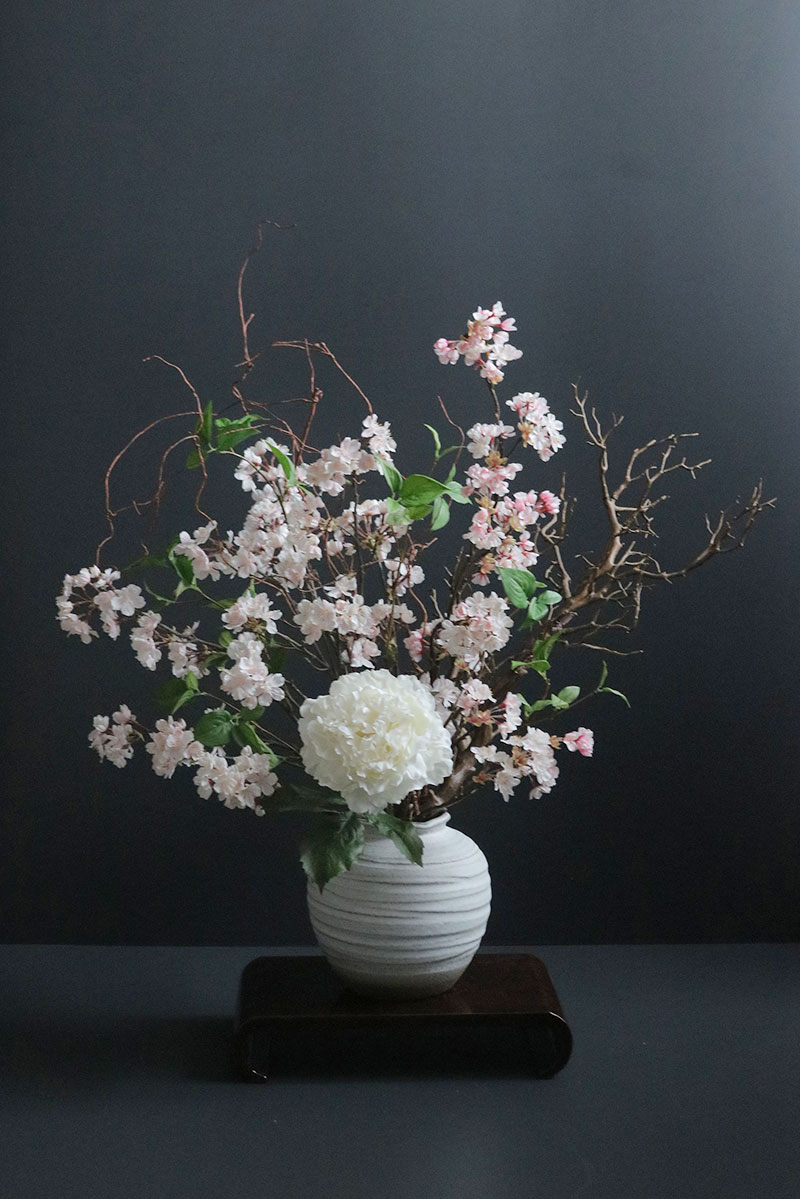 上品で柔らかな色合いの桜と大輪の芍薬に信楽焼の花器を合わせた華やかで目を引く和風アレンジです。床の間や玄関はもちろん、旅館・料亭、和食店などのお店の雰囲気づくりにもぴったりで、季節感のあるおもてなしを気軽に演出できます。