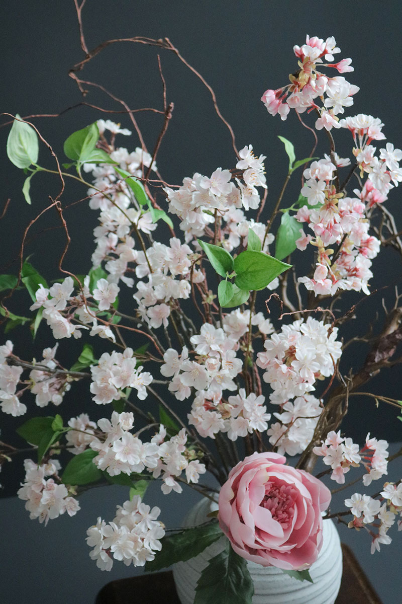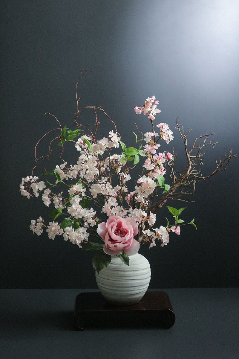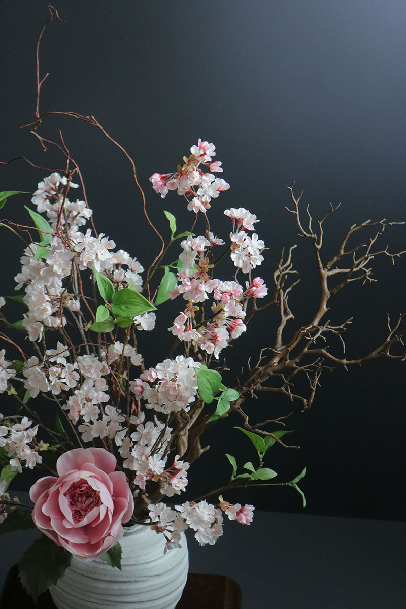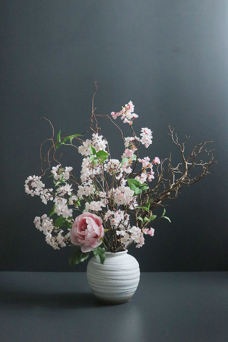 上品で柔らかな色合いの桜と大輪の芍薬に信楽焼の花器を合わせた華やかで目を引く和風アレンジです。床の間や玄関はもちろん、旅館・料亭、和食店などのお店の雰囲気づくりにもぴったりで、季節感のあるおもてなしを気軽に演出できます。