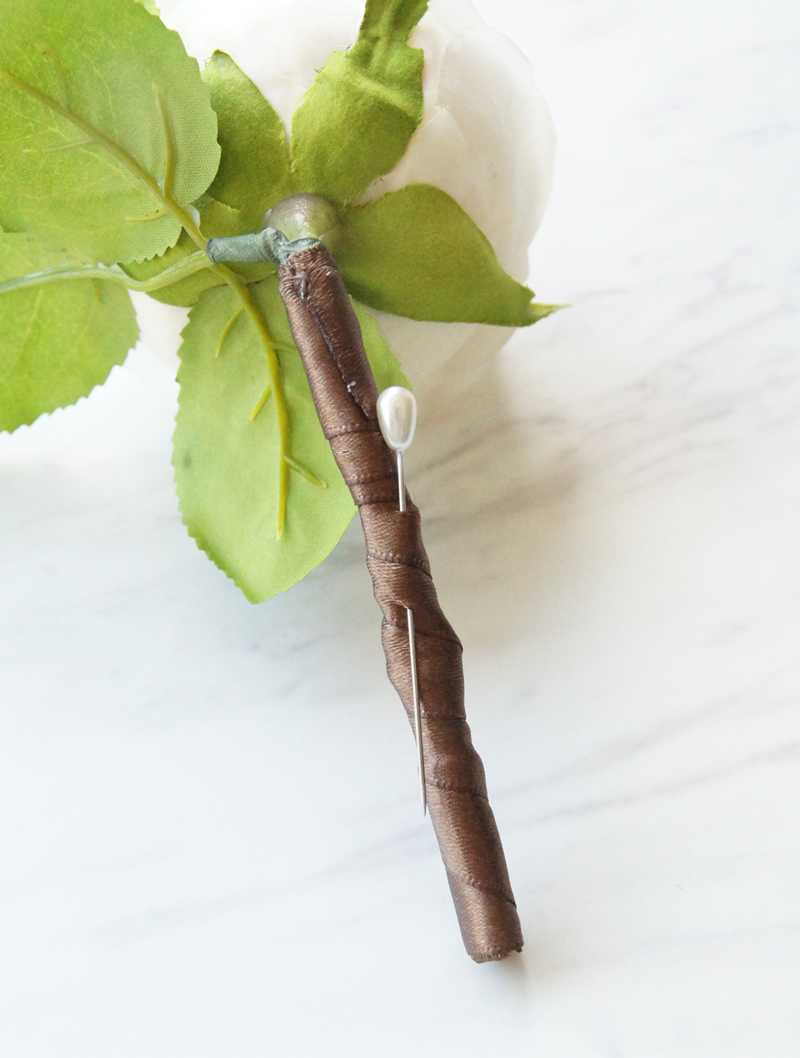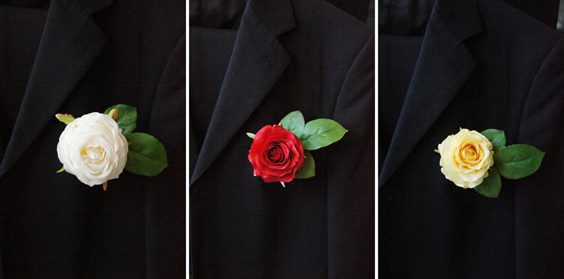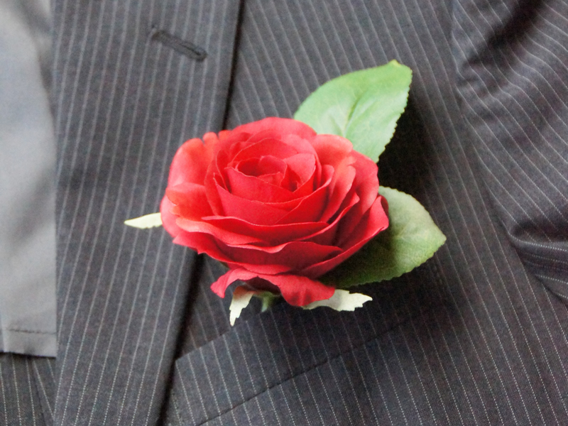 スーツの胸元に飾るシンプルな薔薇のコサージュのご紹介です。