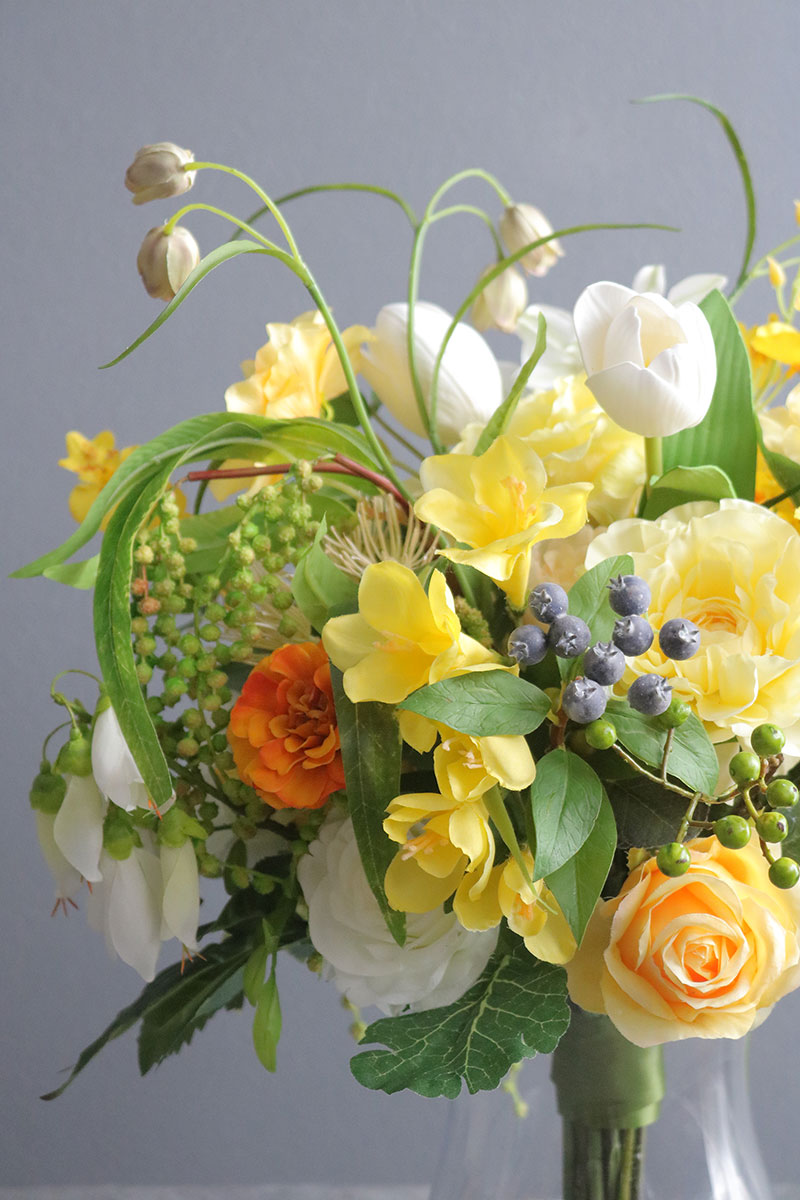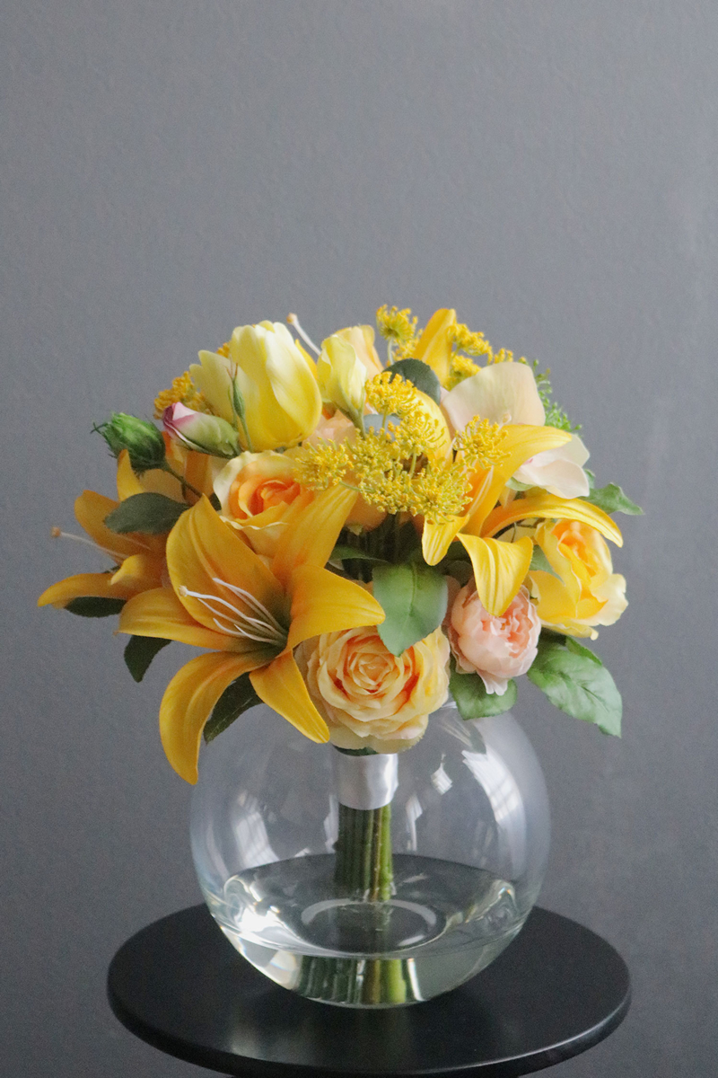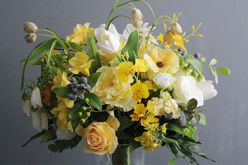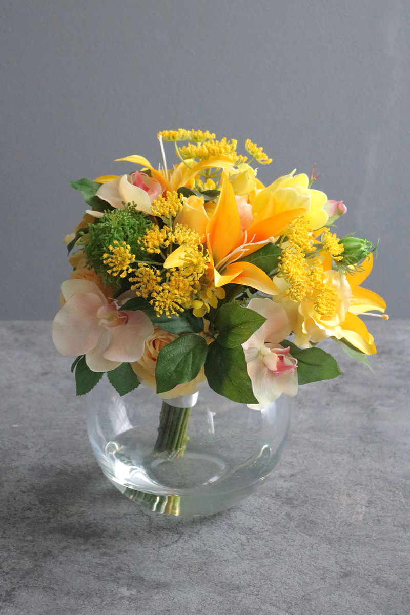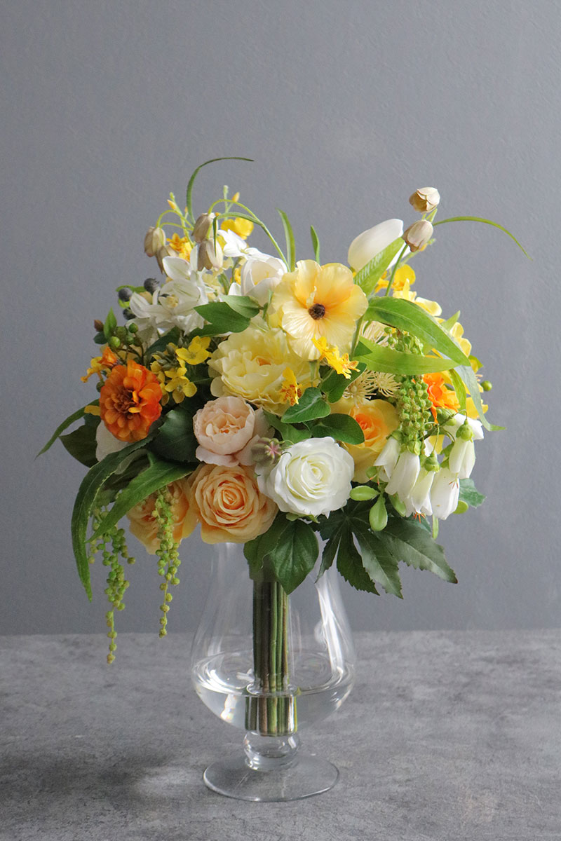 イエローやオレンジなど明るいビタミンカラーの花材を束ねたボリューム満点のブーケアレンジメント。