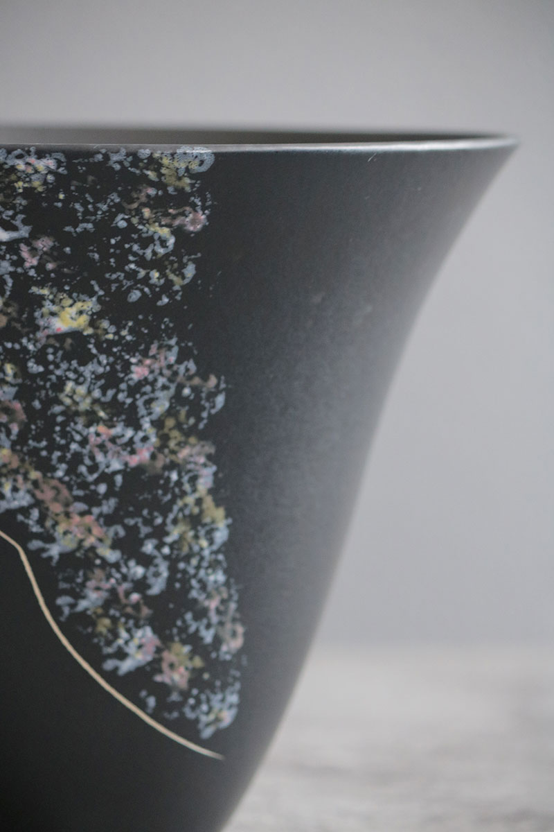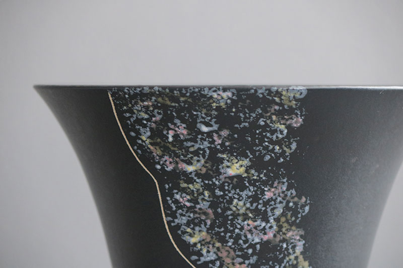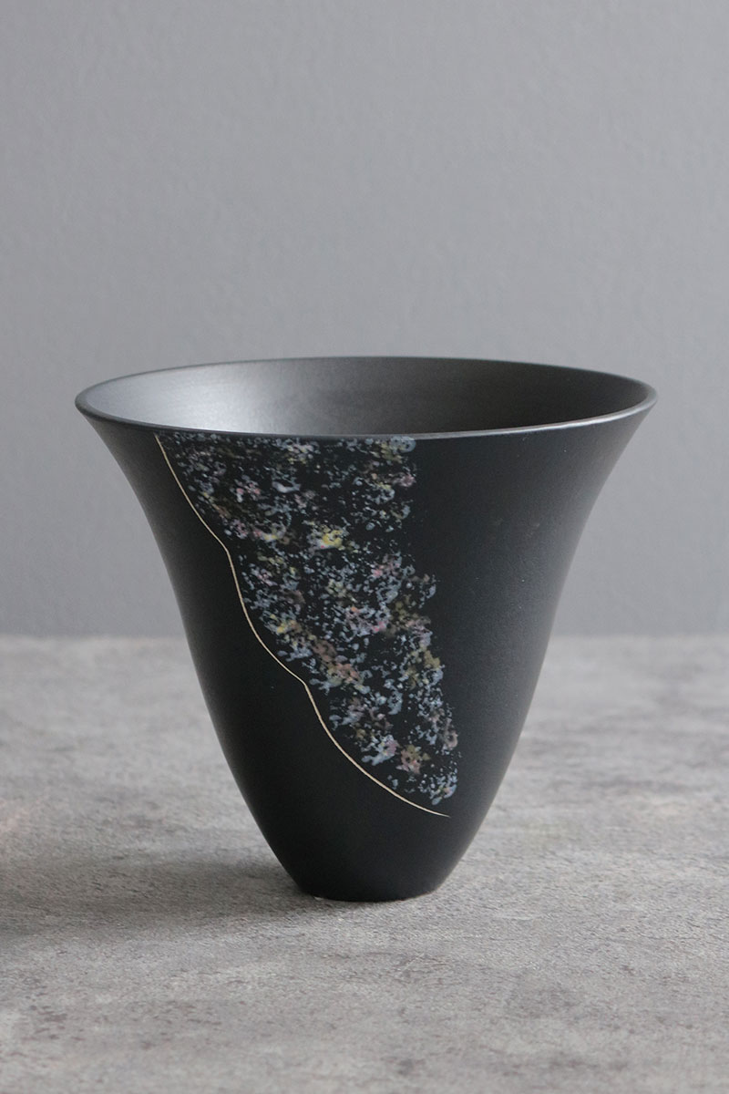 深い色合いのシンプルながらも存在感がある万古焼 花器。お花の種類を選ばず、和洋どちらにも合わせやすい作品です。