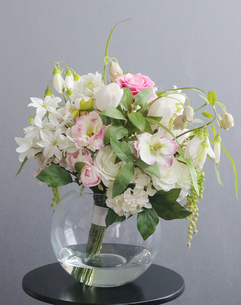 水に入った花器に生花を活けているような瑞々しくリアルな印象で、本物みまごう仕上がりです。上質な花材のみを厳選し、全く同じものはない唯一無二のアレンジメントをお届けしますので、誕生日や記念日など贈り物にもぜひどうぞ♪