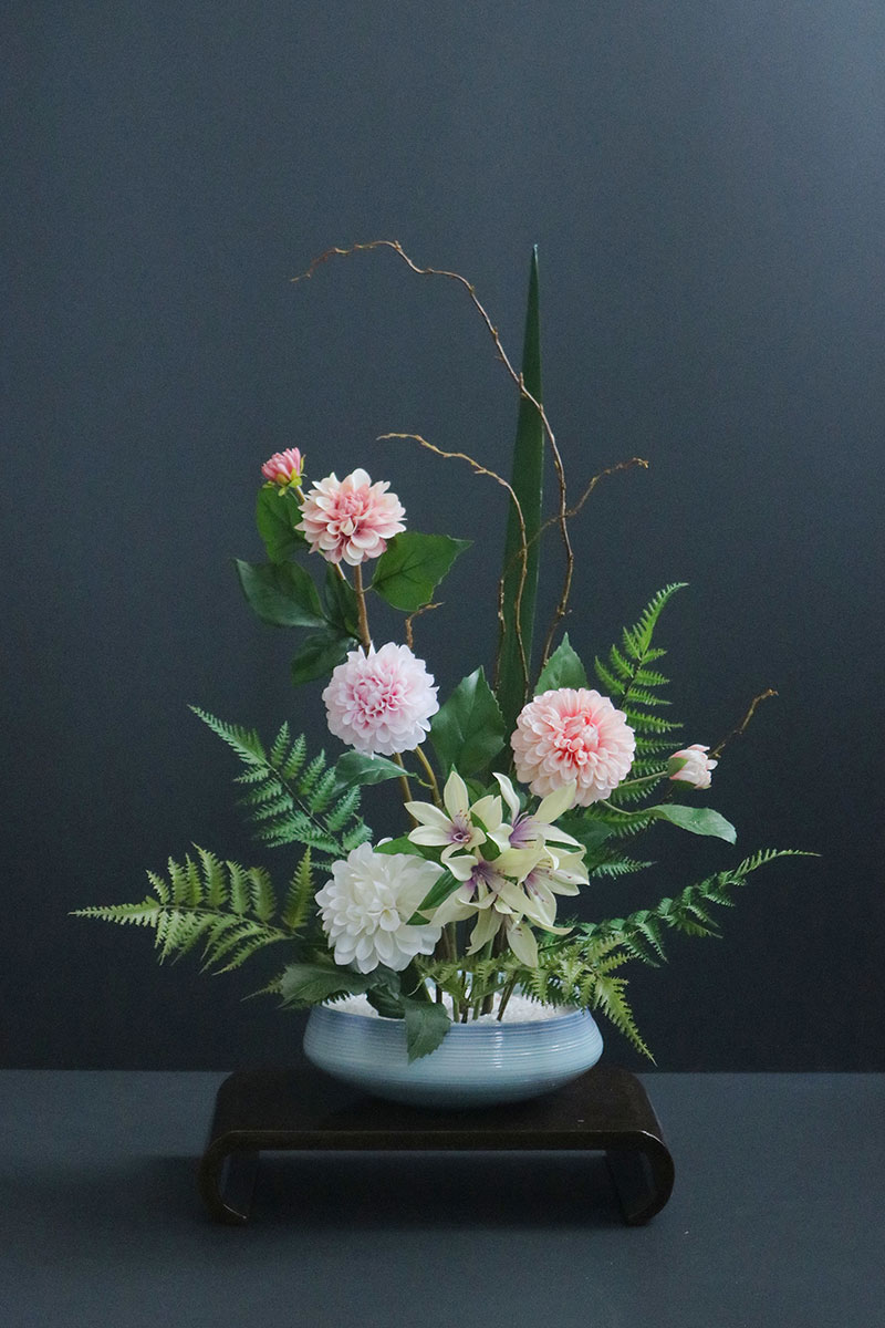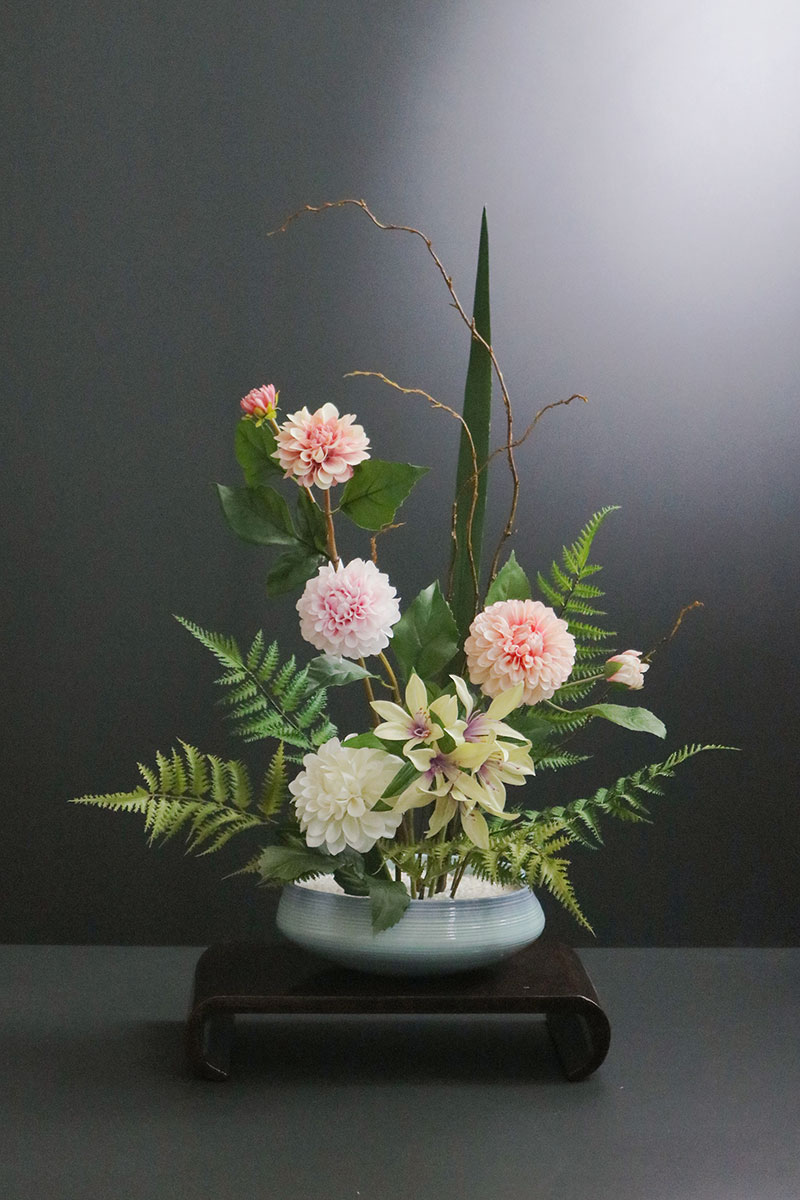 ダリアに枝ものと葉を合わせて動きをつけた奥行きある和風アレンジメントです。少ない花材を生かして空間の美を演出する活け花の特徴を生かしたスタイルです。一年中楽しんでいただける色合いです。