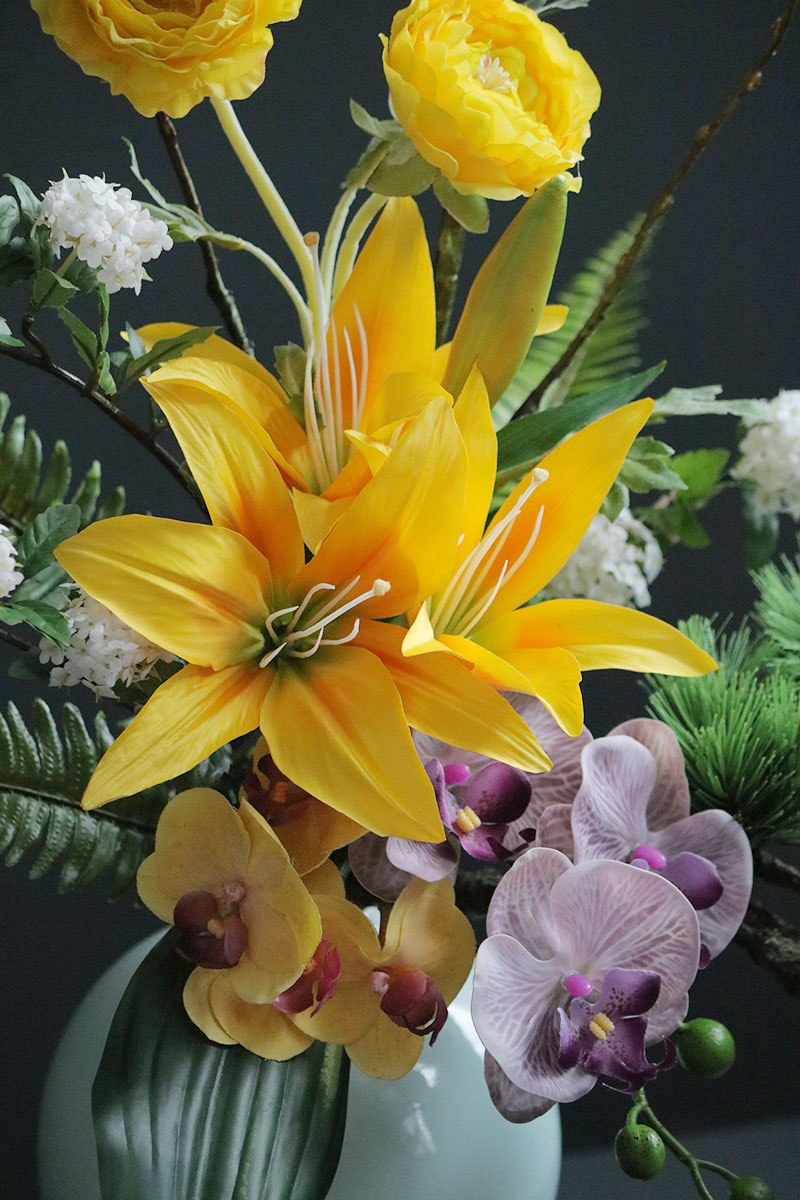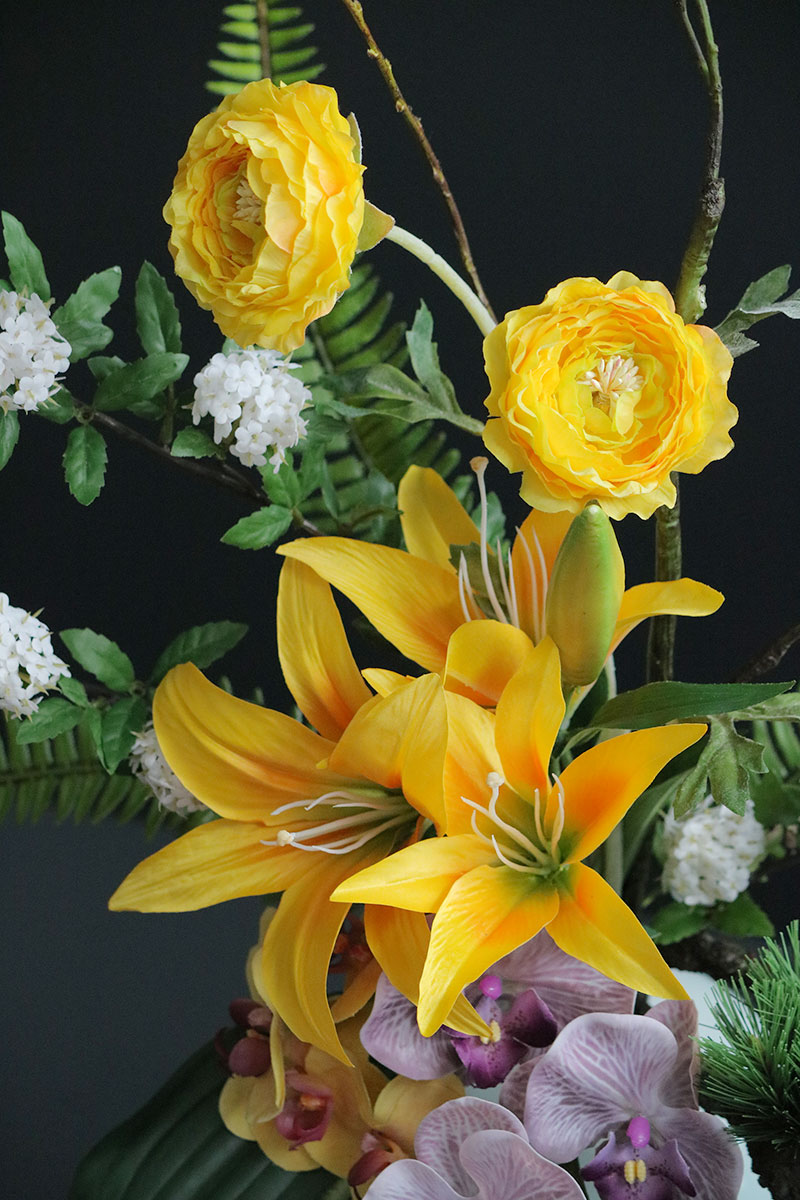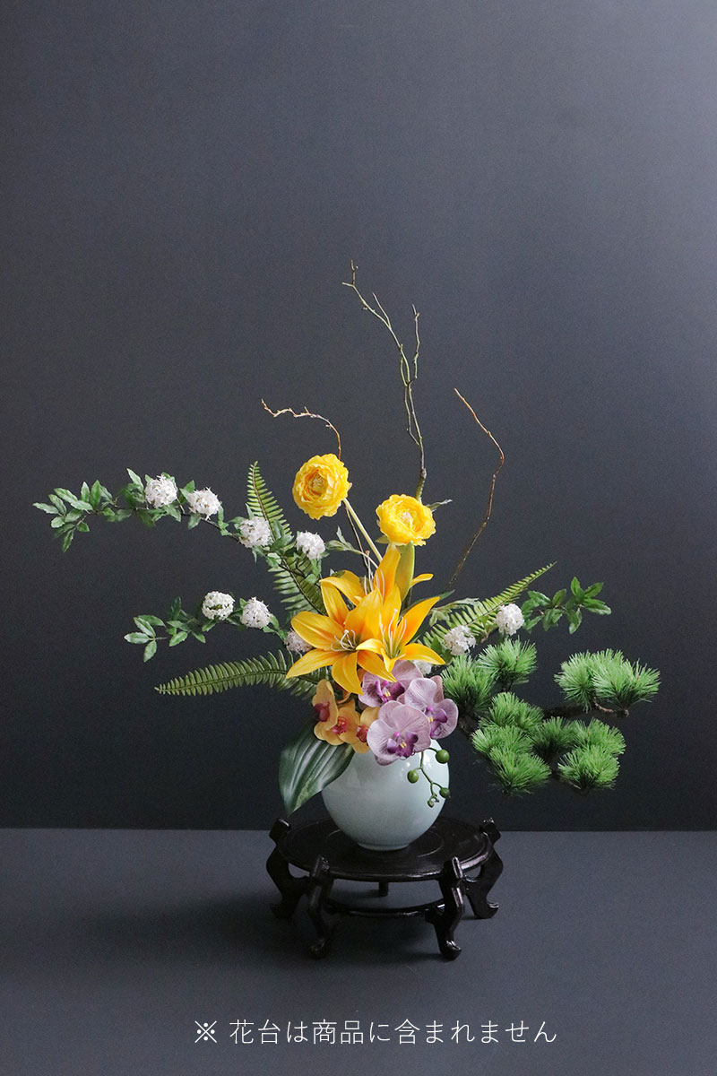 黄色の鮮やかなダリアとラナンキュラスが目を引き、胡蝶蘭とコデマリ、さらに作家による手作りの松の枝を合わせた、存在感があるアレンジメントです。玄関や和室の床の間、料亭や旅館などの装飾にも最適です。