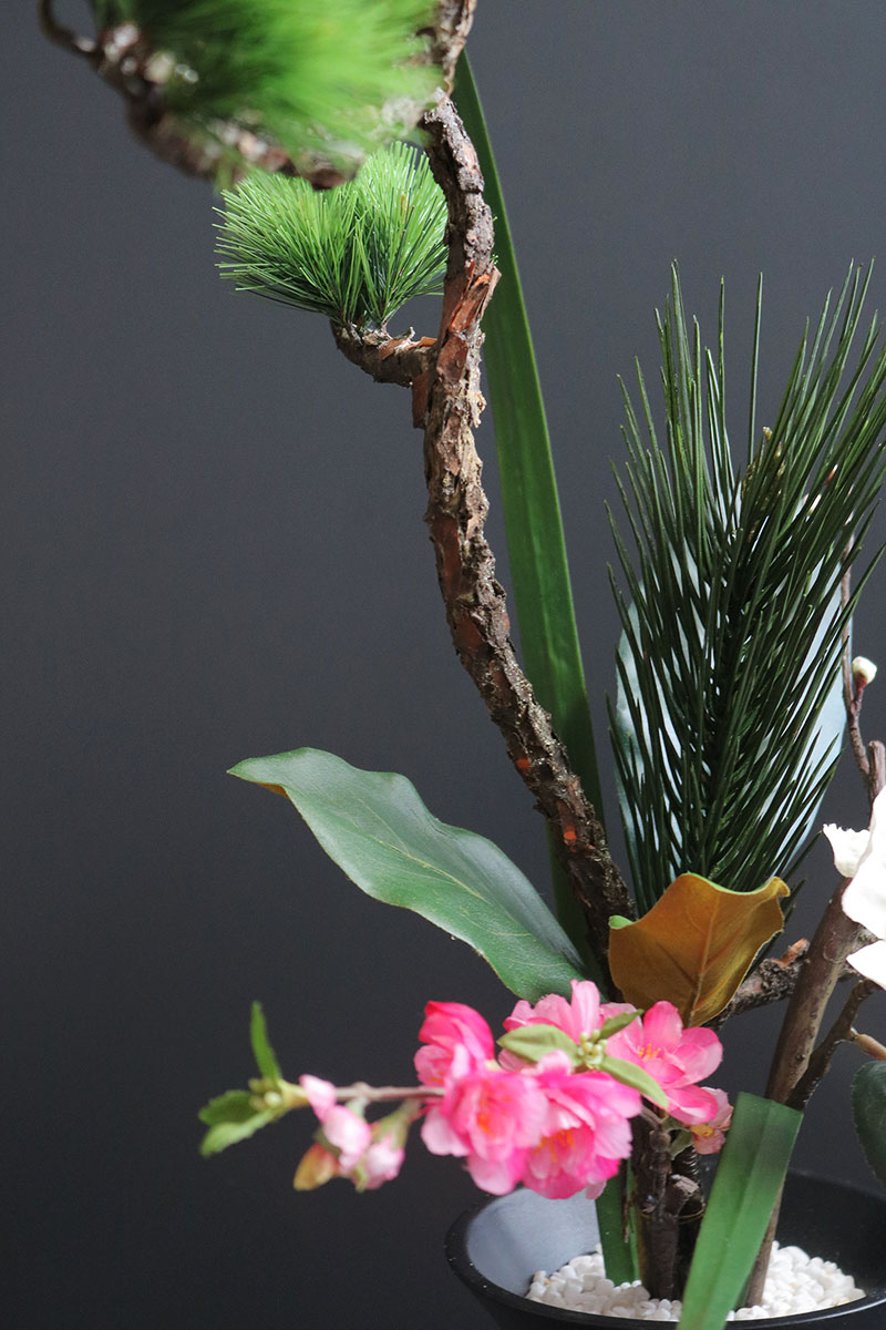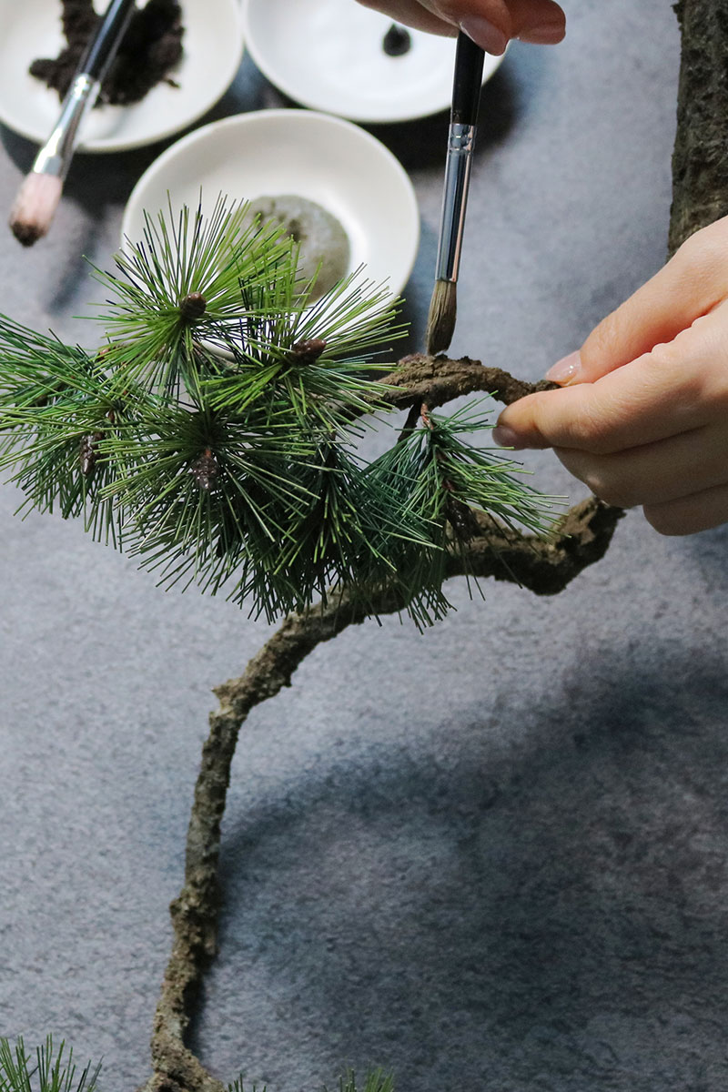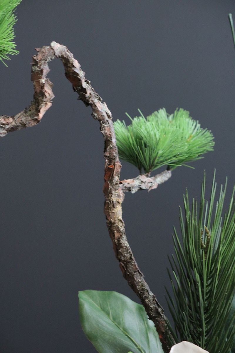 松枝は作家が一本一本手をかけながら丁寧に仕立て、年輪を重ねたような深みのある渋い樹皮まで、繊細に表現しています。