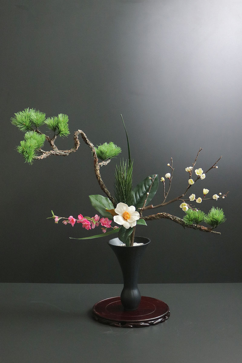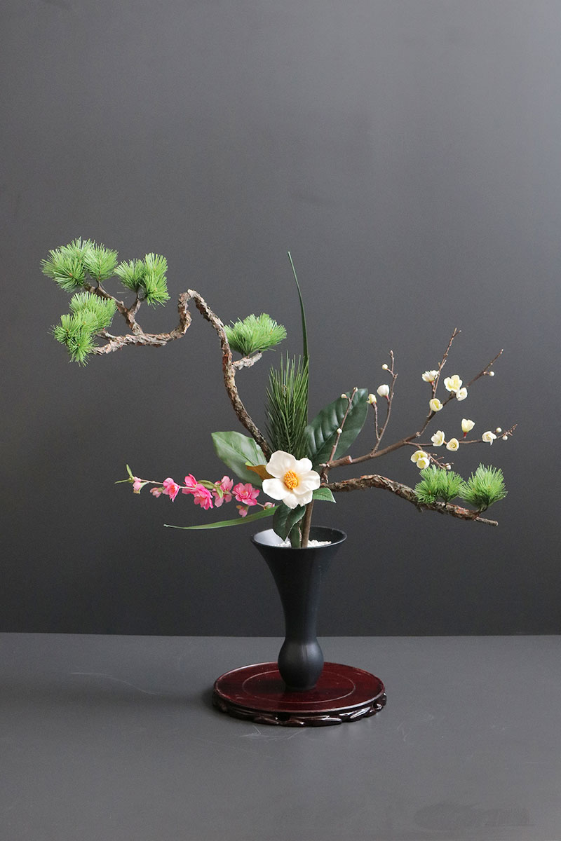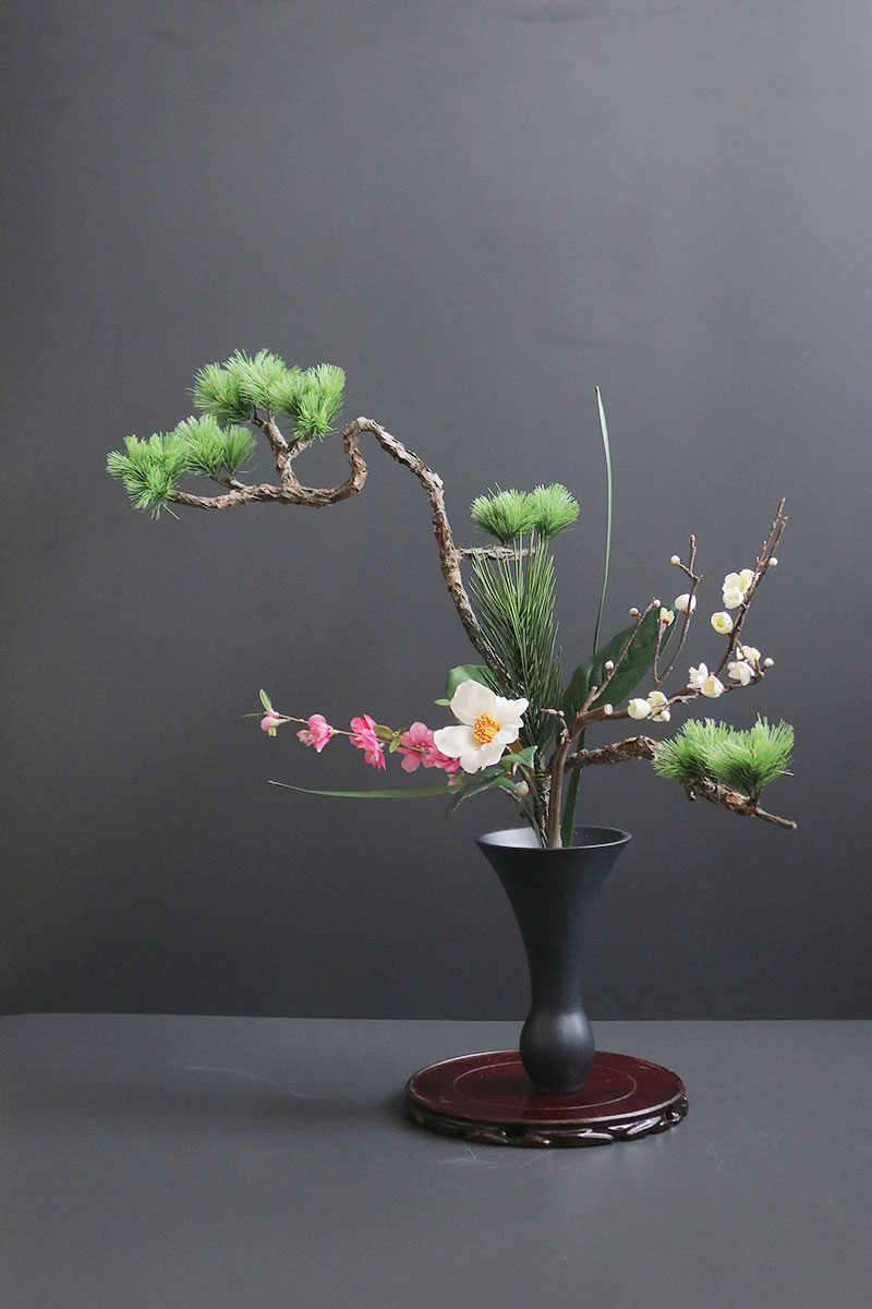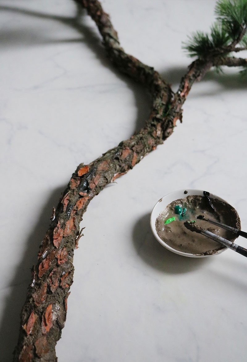 松枝は作家が一本一本手をかけながら丁寧に仕立て、年輪を重ねたような深みのある渋い樹皮まで、繊細に表現しています。