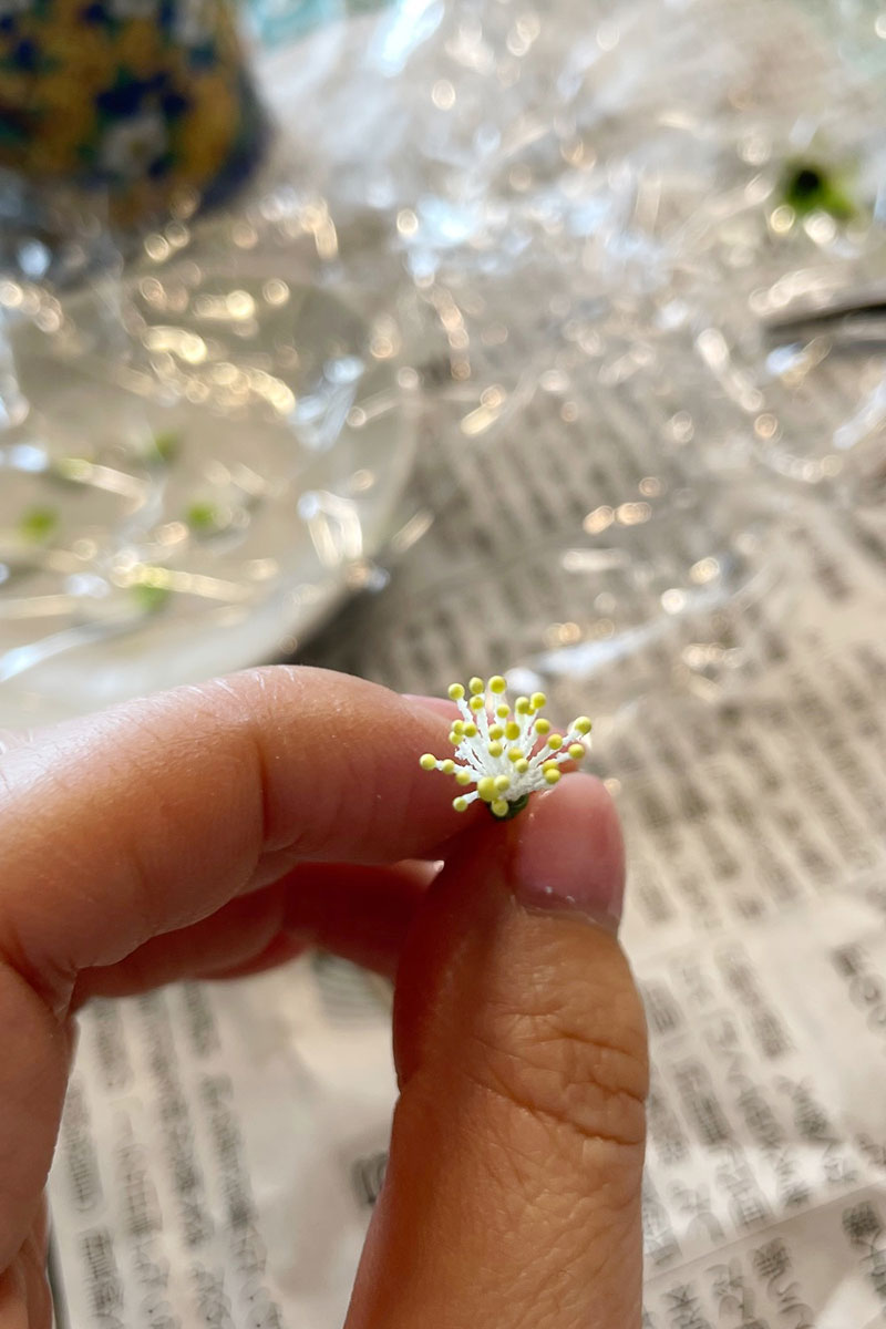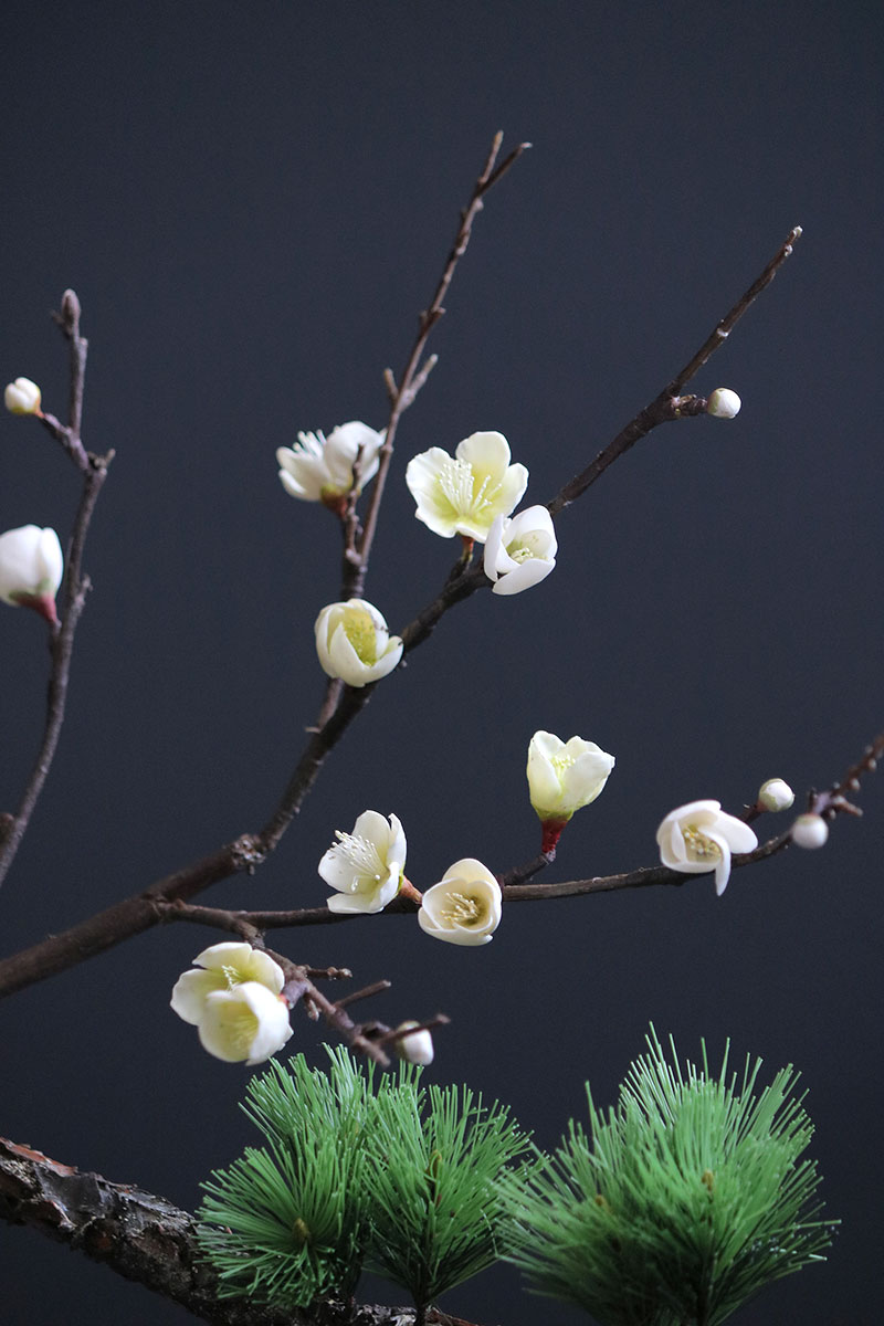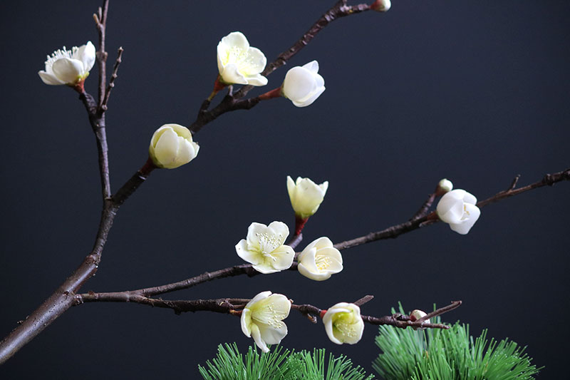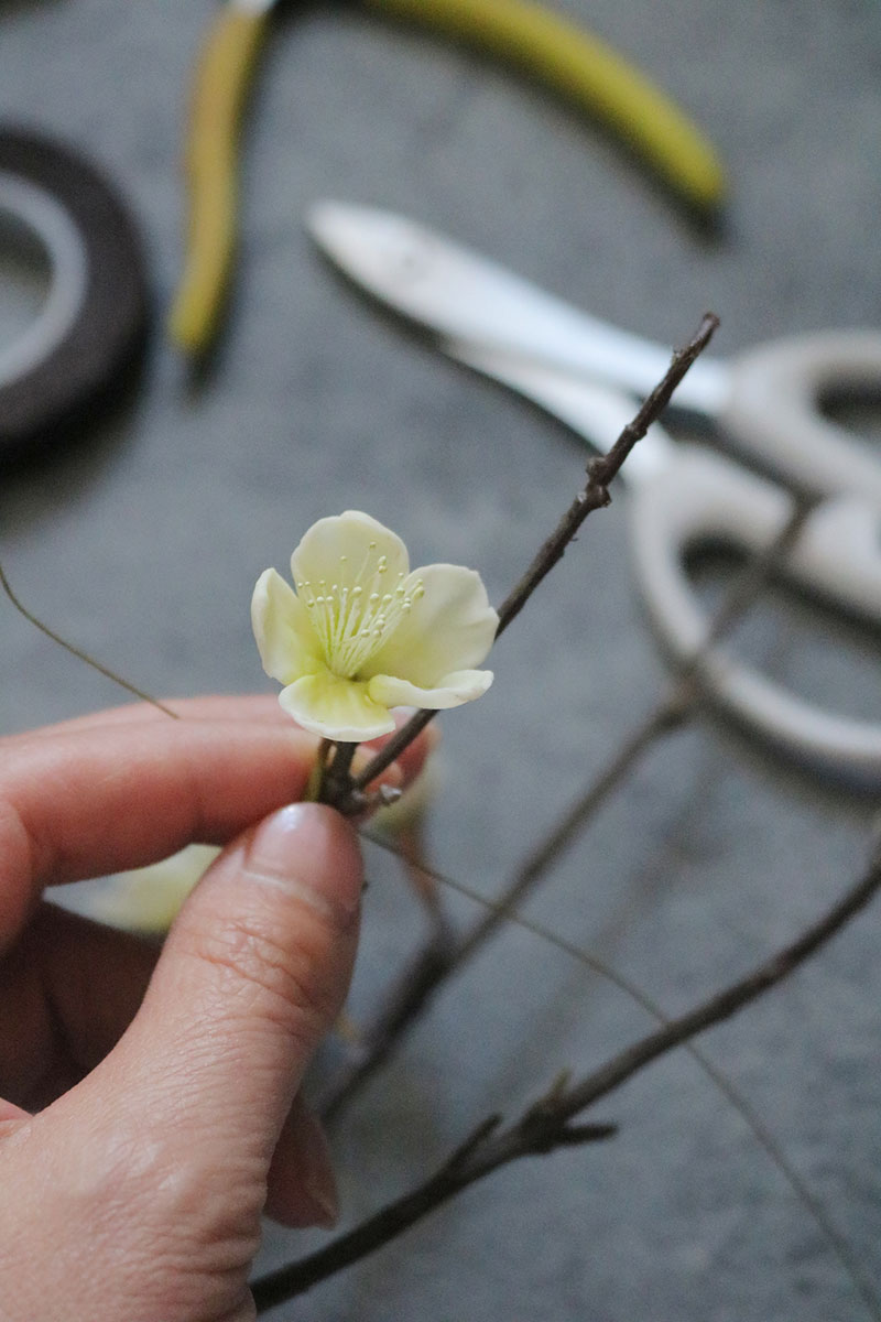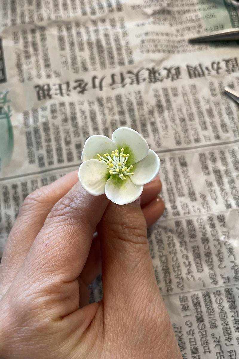 梅の花にも樹皮粘土を使用し、花びら一枚一枚、めしべ・おしべ一本一本に至るまで、成形や色付けを重ねながら、時間をかけて丁寧に仕上げています。