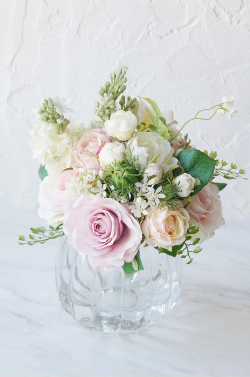 水に入った花器に生花を活けているような瑞々しくリアルな印象で、本物みまごう仕上がりです。上質な花材のみを厳選し、全く同じものはない唯一無二のアレンジメントをお届けしますので、誕生日や記念日など贈り物にもぜひどうぞ♪