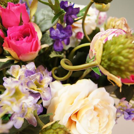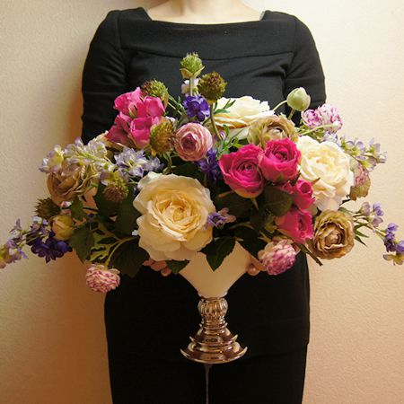 主にバラとラナンキュラスを豊富にアレンジし、動きとボリュームある仕上げにました。とても豪華で綺麗な形なので贈物にきっと喜ばれます。新築や開店祝いなどにも最適です。