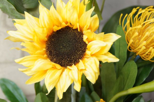 眩しいくらいのヒマワリと合わせるようにイエローのカラーを組み合わせたとても明るいアレンジです。