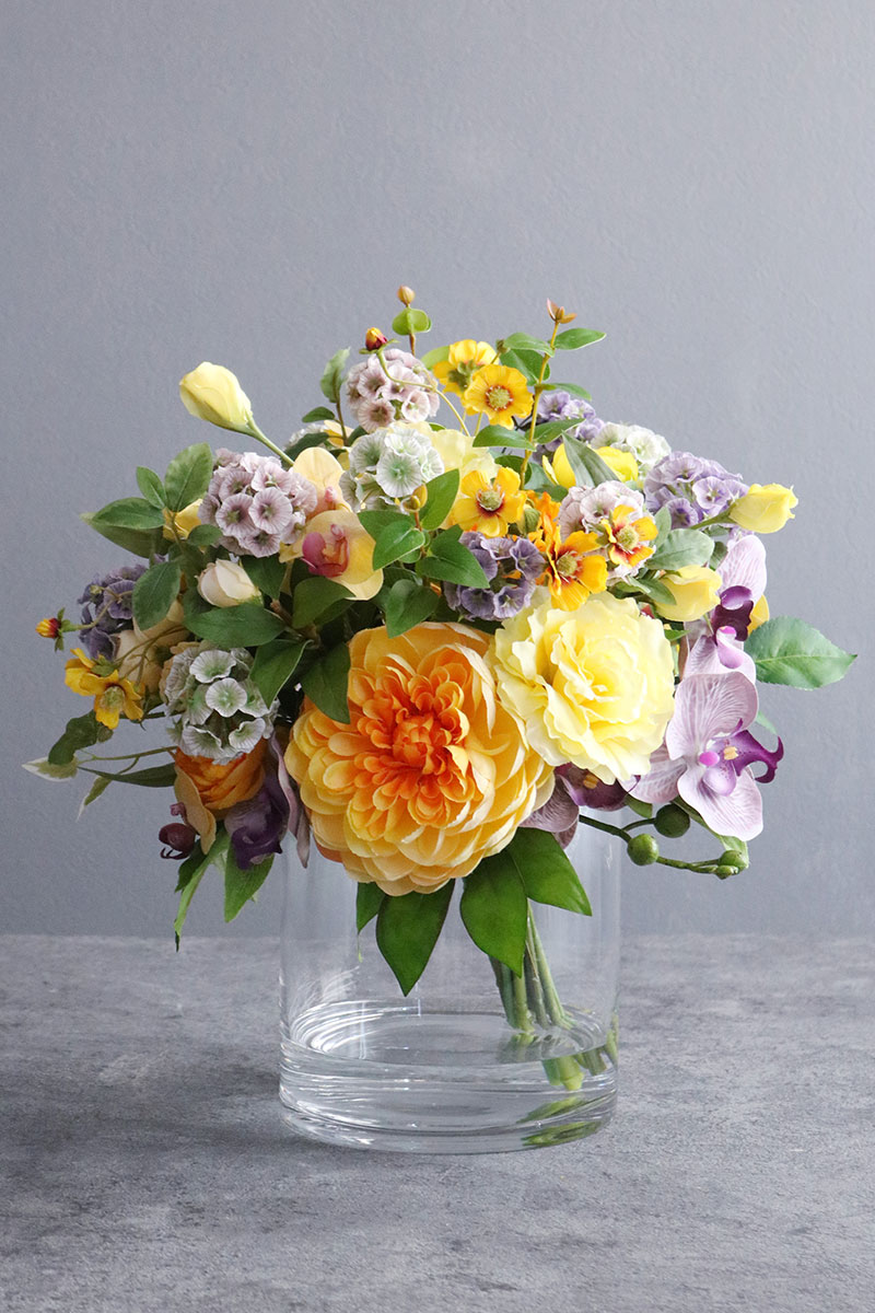 イエローダリア × パープルスカビオサブーケ シリンダーベース