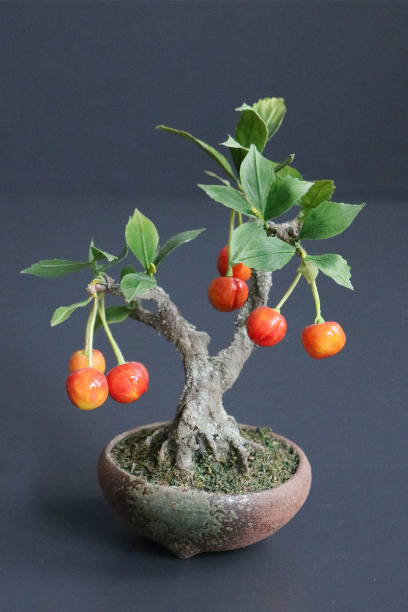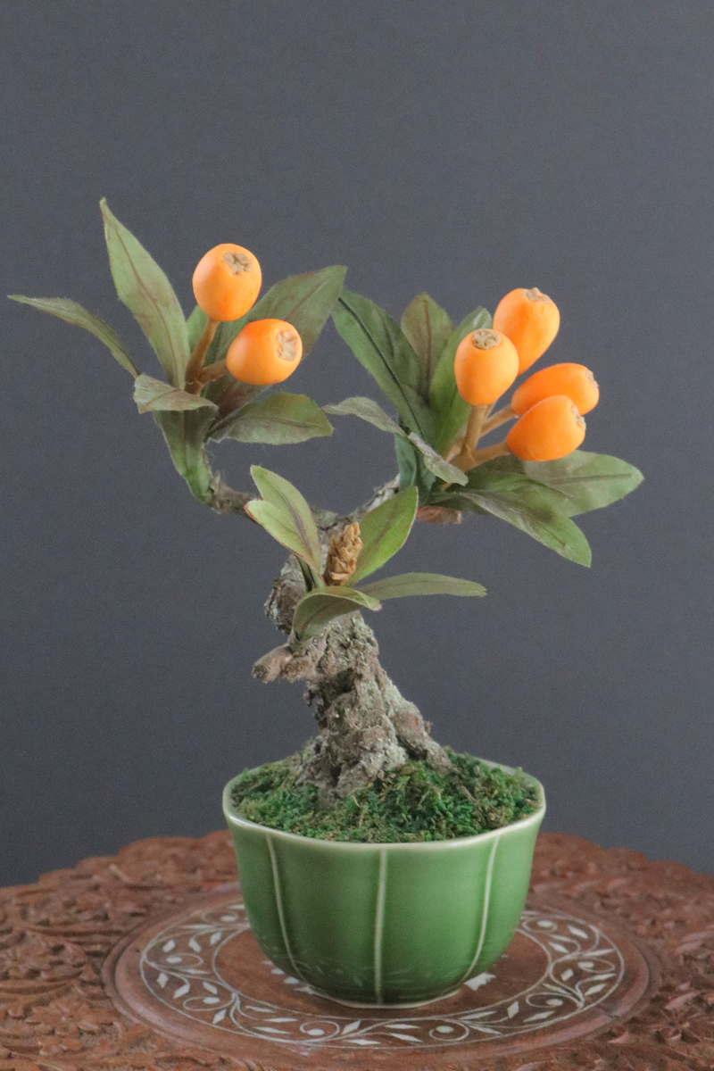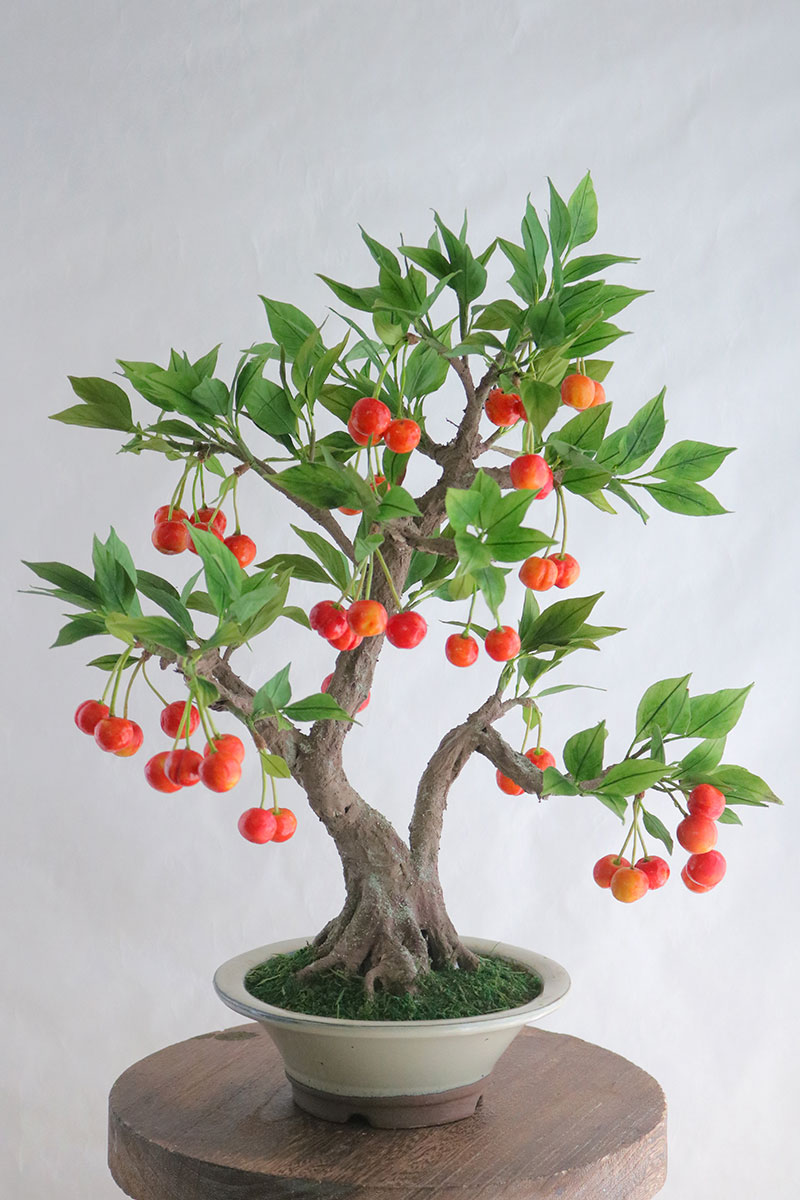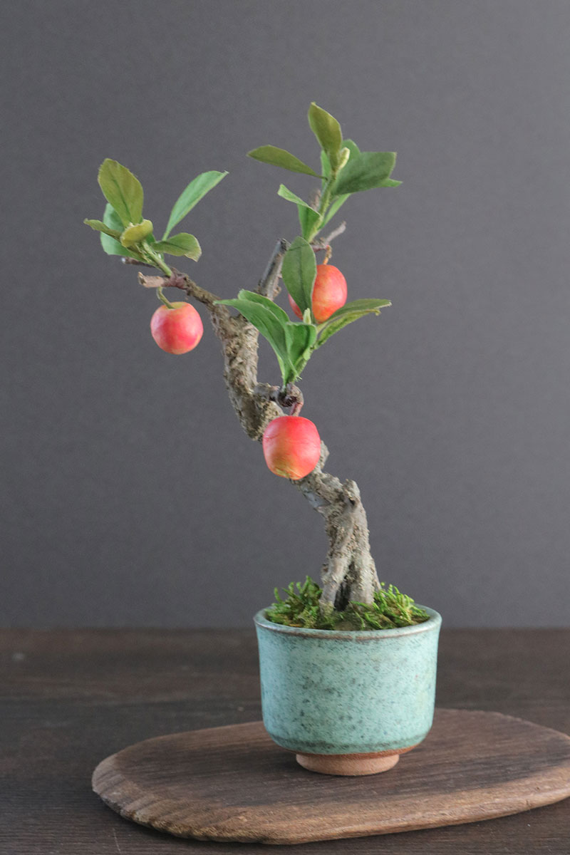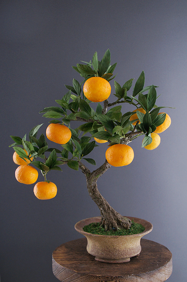 果実一粒ひとつぶから葉っぱ一枚いちまいまで、形成や色付けなど、細部まで丁寧に時間をかけ精巧に手で作り込み、至近距離でも本物と見分けがつかないほどの仕上がりです。 手入れや水やりなど一切の手間をかけずお楽しみいただけますので、格調高いインテリアアイテムとして、また海外へのお土産や贈り物としてぜひご利用ください。オーダーメイドのご注文も承ります。 Bonsai made using clay, paper and wire by Japanese Bonsai creators. Great for decoration and for souvenirs or gifts. Able to ship overseas(日本クラフト盆栽作家協会監修作品)